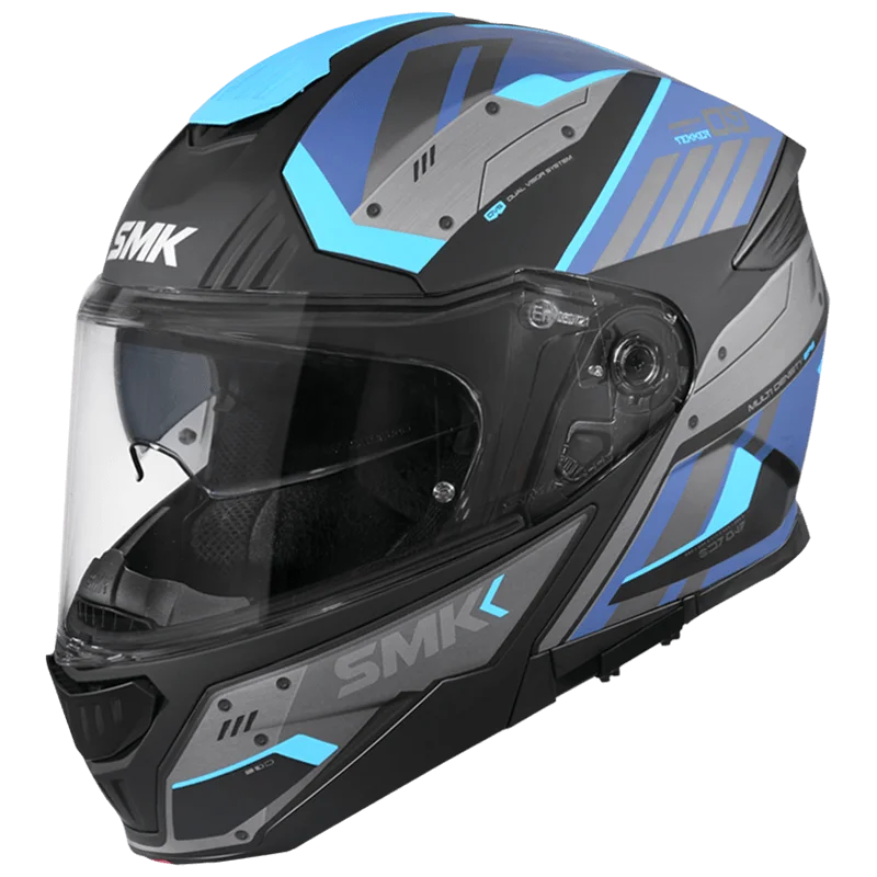 SMK Gullwing offers a complete range of features such as Internal Retractable Sun Visor, Wind Stop, and Pinlock®70 ready visor. Available in solid colors and high-visibility graphics, these helmets offer you complete Style & Safety!