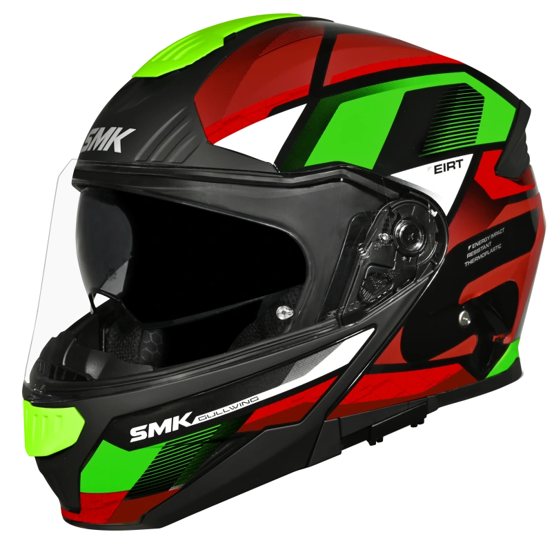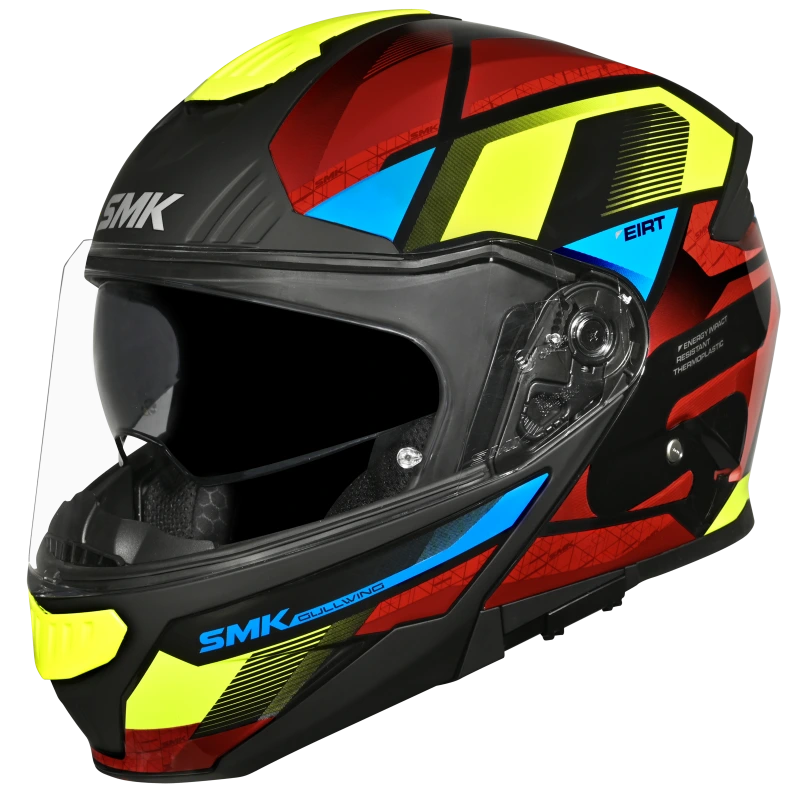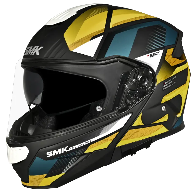 SMK Gullwing offers a complete range of features such as Internal Retractable Sun Visor, Wind Stop, and Pinlock®70 ready visor. Available in solid colors and high-visibility graphics, these helmets offer you complete Style & Safety!